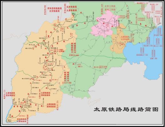 太原鐵路局由原屬于北京鐵路局的太原鐵路分局和大同鐵路分局組成,所轄的線路東起秦皇島,西至禹門口,北到大同,南至風陵渡,橫跨山西、河北、北京、天津兩省兩直轄市,線路總延長7561.3公里,鐵路營業里程2951公里,下設37個運輸生產站段。