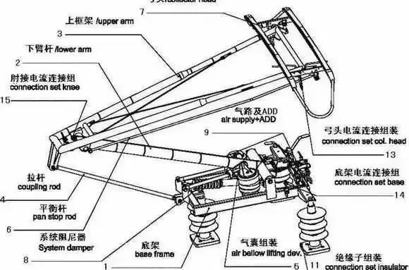 當列車運行時,它就會在氣壓的作用下升起來從接觸網獲得直流1500伏電壓,其工作原理很簡單:從空壓機獲得氣體推動氣囊拉起下臂桿,其實就是四連桿機構。