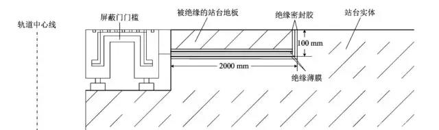 在門體內部,利用接地導線將各種金屬部件連接到銅排(或電纜)上,然后將銅排(或電纜)接至連接電纜。連接電纜最后連到離端門10~20米處鋼軌的連接孔上,以確保門體與列車車體等電位。為了避免乘客觸電的危險,將屏蔽門整個下部支撐結構的表面涂上特殊的絕緣材料,同時在屏蔽門前方900mm范圍內鋪設了橡膠地板,達到了雙重絕緣的效果,簡稱橡膠地板方案。還可以在站臺層內敷設絕緣薄膜的方式,形成絕緣帶,也可以達到同樣的效果,簡稱絕緣薄膜方案。橡膠地板電阻值較高,敷設在地面面層,乘客防電擊的安全系數大大提高,同時也達到了車站的整體裝修效果。具體做法為在距離屏蔽門邊約900mm寬,站臺通長范圍內敷設3.5mm厚的橡膠地板,基面到完成面的預留厚度為8mm。方案示意圖如圖2。